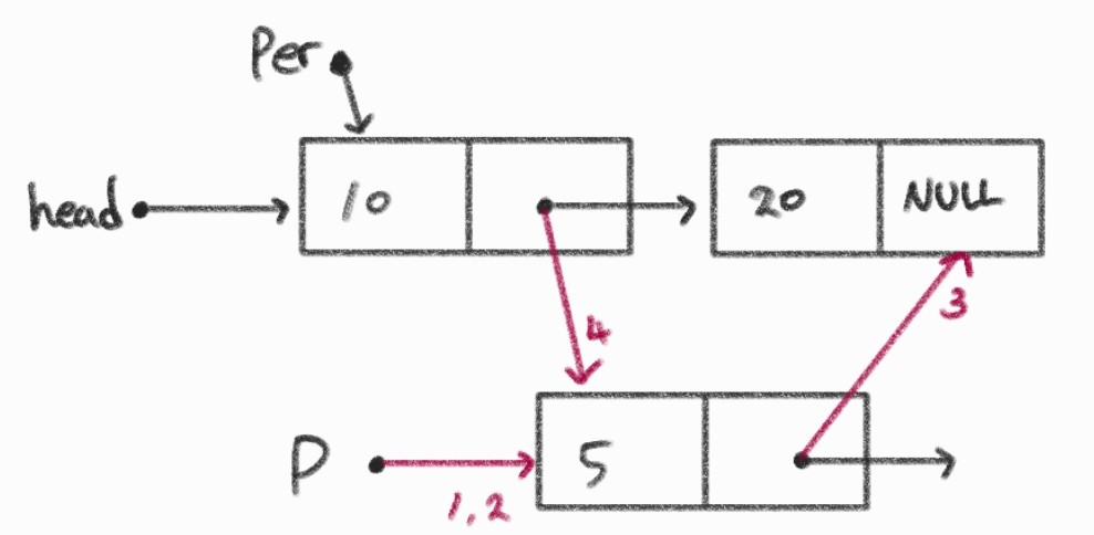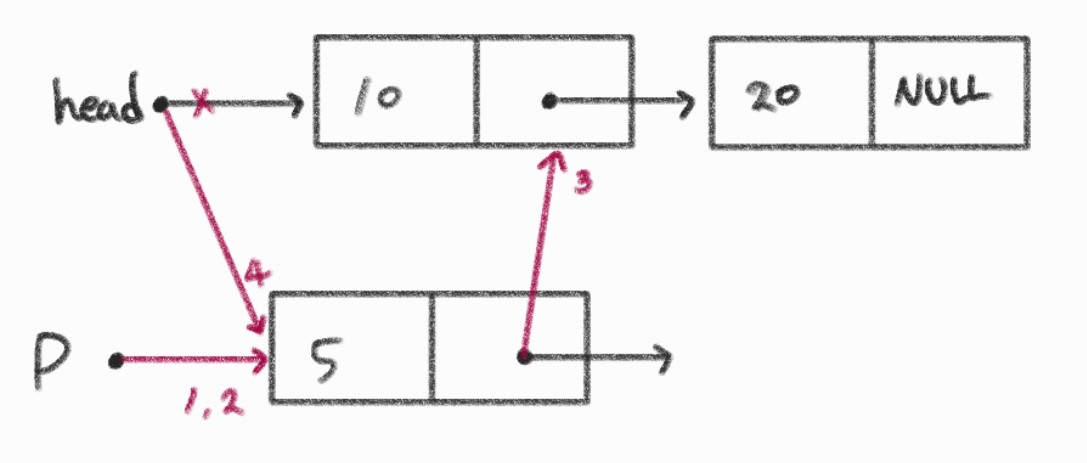 head->link에 p를 저장하면 첫 번째 노드의 링크가 두 번째 노드를 가리키게 된다.
