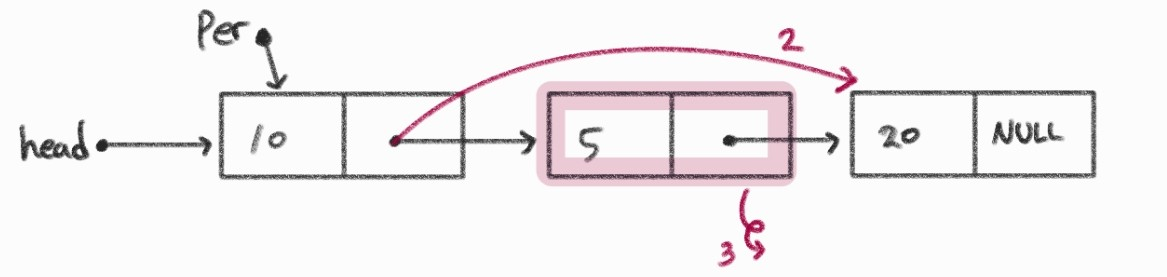 - per의 링크 필드가 삭제할 노드가 가리키는 노드를 가리키게 한다.