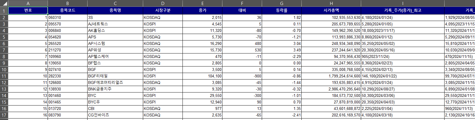 한국 거래소(krx)에서 코스피, 코스닥의 종목 코드가 포함된 업종분류형황을 다운받는다.