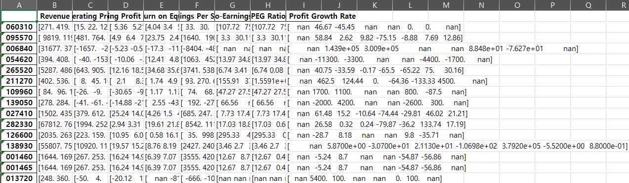코스피와 코스닥에 있는 모든 종목의 매출액, 영업이익, 영업이익률, ROE, EPS, PER, PEG, 영업이익증가율을