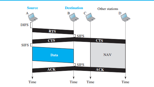 송신 스테이션은 매체의 에너지 수준을 감지하여 채널이 비어 있는지 확인합니다. 채널이 비어 있으면 DCF 인터프레임 간격(DIFS) 동안 대기 후 RTS(Request to Send) 제어 프레임을 전송합니다. - CTS 수신: