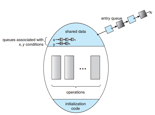 - 모니터 내에서는 상호 배제(mutual exclusion)가 자동으로 보장된다. 즉, 동시에 하나의 프로세스만 모니터에 접근할 수 있다.