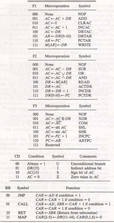 - Microoperations: 표에서 정의된 1~3개의 기호로 구성되고 최대 3개 연산을 쉼표로 구분해 지정. (NOP은 연산 없음).