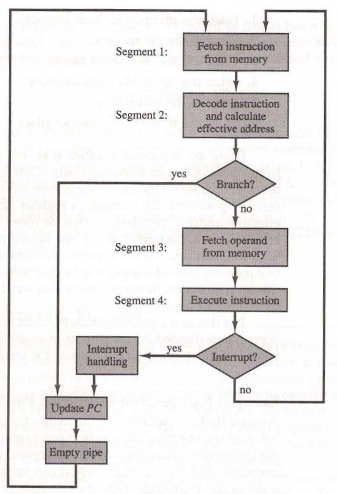 - 네 세그먼트 파이프라인을 가진 CPU에서 명령어 사이클이 수행되는 과정