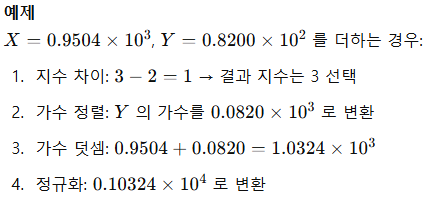 - 가수 정렬: 작은 지수를 가진 가수를 오른쪽으로 이동시켜 정렬한다.